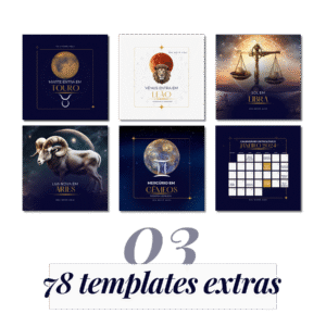 Templates extras no formato para feed sem legendas para postar as previsões. Tem templates de calendário astrológico de cada mês, os planetas nos signos, previsão dos signos e muito mais
