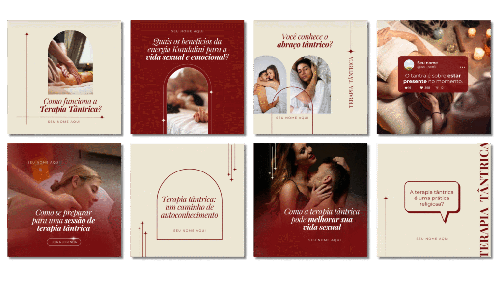 Você terá acesso à artes prontas, com conteúdo e legendas estratégicas para Terapia Tântrica e irá conquistar um perfil profissional e atraente para atrair mais clientes todos os dias em poucos cliques!